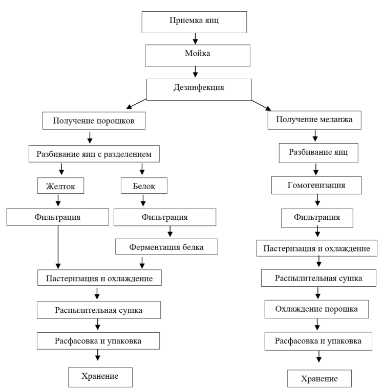 Технологический процесс производства яичных порошков включает следующие операции: прием яиц; сортировка и санитарная обработка; взвешивание и разбивание яиц; извлечение и разделение содержимого на желток и белок; фильтрацию, перемешивание; пастеризация; распылительная сушка яичной массы, фасовка яичного порошка, его упаковка; транспортировка и хранение.